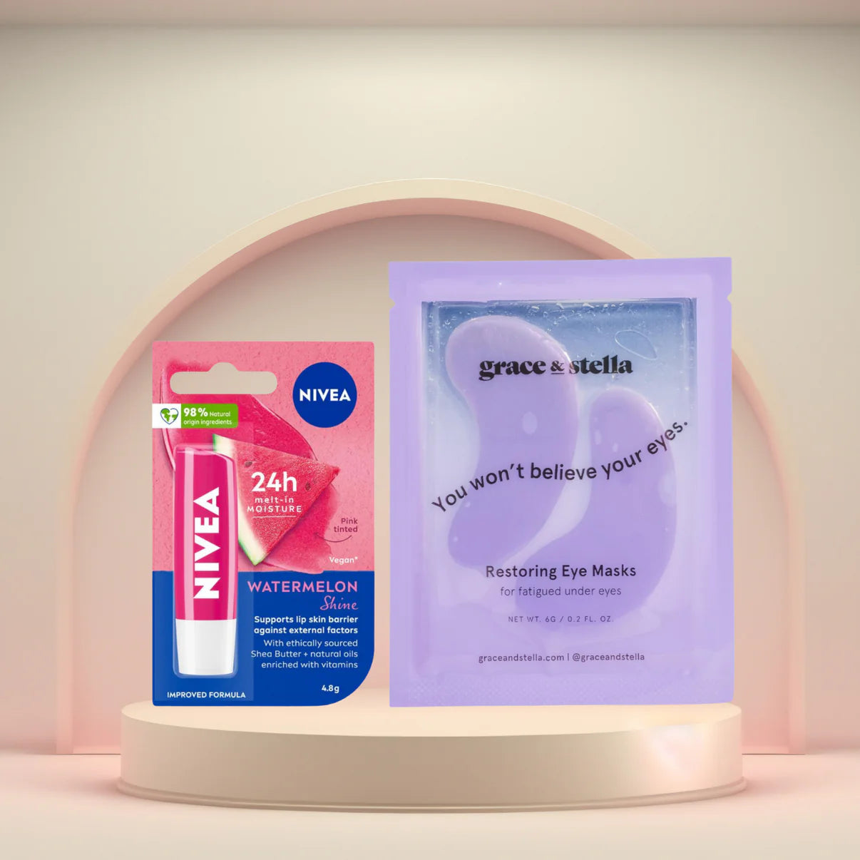 Replenish and revitalize your skin with our Glow Up Besties! Pamper your tired eyes with the Stella & Grace Restoring Under Eye Mask, reducing puffiness and dark circles. Then, soothe and hydrate your lips with the Nivea Lip Balm.